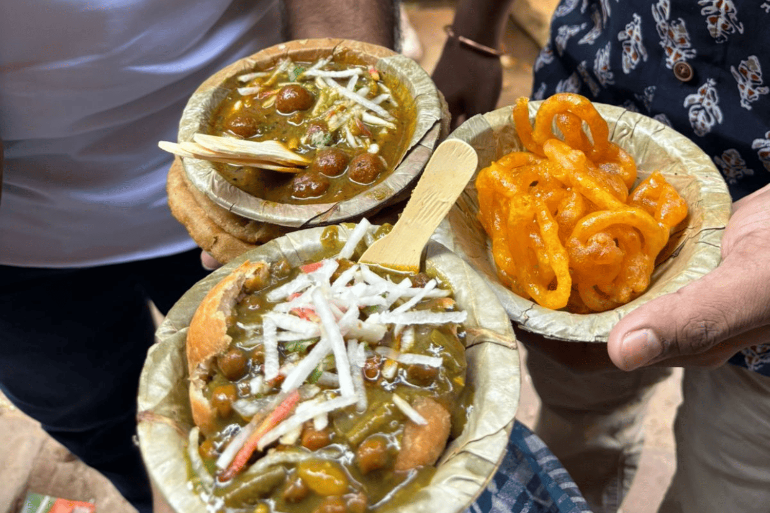 Since we left early in the morning, we were hungry, so we went to the famous Laxmi Chai for some Chai and Malai toast. Many locals come there daily to sip tea and talk with their friends. As we were exploring the lanes (galis) of Kashi, we smelled the fragrance of hot Kachoris and Jalebi from the popular food stall Ram Bhandar. They had a token system as there was a huge line for the Kachoris. We sat near the stall waiting for our number, people were enjoying the local delicacies with their loved ones.